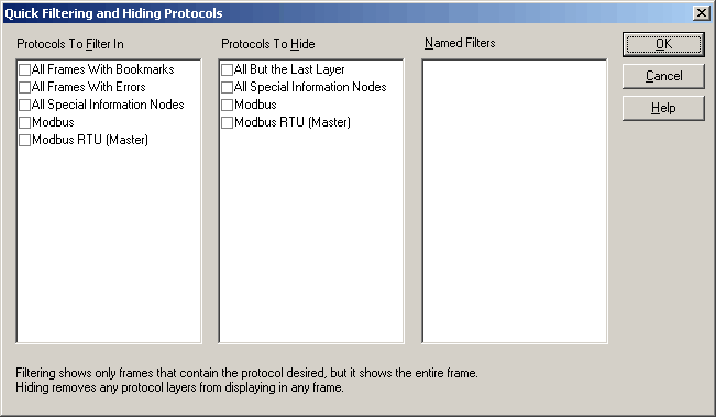 Okno Quick Filters (Rychlé filtry) je vyvolatelné z okna Frame Display a poskytuje další výkonnou a přitom snadnou možnost zahrnout/vyloučit/skrýt rámce (zprávy) které obsahují určitý protokol.