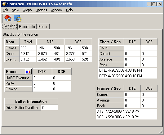 Okno Statistics poskytuje pro živá nebo nasnímaná data součty zahrnující: