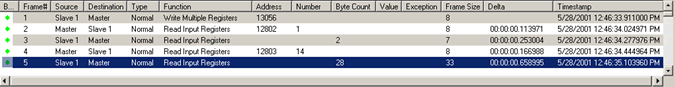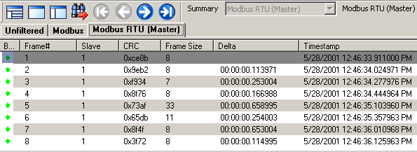 V souhrnném panelu se zobrazuje každý rámec (zpráva) právě na jeden řádek. Jsou obsaženy hlavní dekódované pole hlaviček podle zvolené úrovně protokolů.