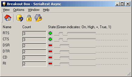 V okně se výhradně živě zobrazuje stav jednotlivých řídících signálů z RS-232: DTR, RTS, CTS, DSR, CD a RI.