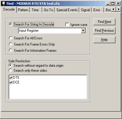 Na úrovni rámce může funkce Find 1) prohledat text dekódu na zadaný řetězec, 2) vyhledat chyby a 3) omezit prohledávání na stranu DTE nebo DCE.